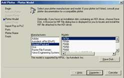 Nos toca elegir el fabricante, y como vamos a configurar el que trae AutoCAD, entonces optas por Hewlett-Packard (en la primera lista) y el modelo (de la segunda lista) será el 7475A, luego pulsas en Siguiente, y en la próxima ventana también le das a Siguiente.