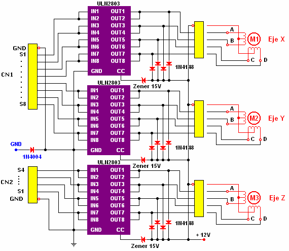 Cada ULN se encarga de manejar la corriente suficiente para un motor, y para que le resulte más liviano se unieron de dos en dos las entradas y las salidas de cada uno, hay que prestarle atención a la polaridad de los diodos 1N4148, que se utilizan como protección para los integrados, por allí apareció un diodo 1N4004 que viene de la masa del circuito anterior, y que hace de retorno de las señales enviadas por la interfaz.