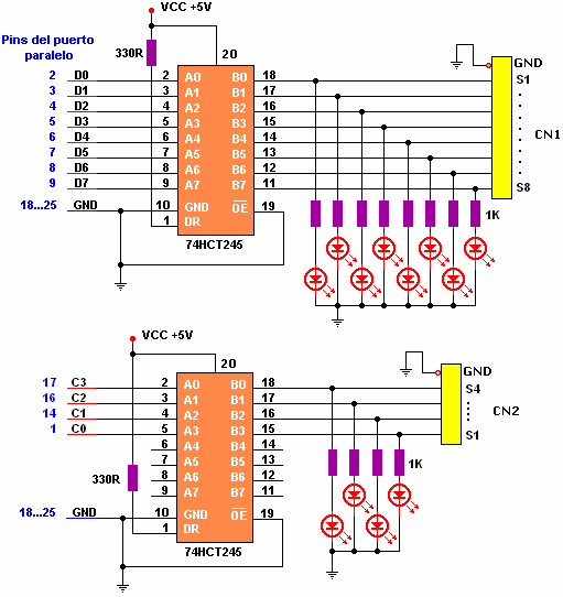 No grafiqué el puerto para que no te hagas un lío con tantas líneas, a demás a estas alturas ya estás más que familiarizado con los pines de este puerto. Los conectores CN1 y CN2 son las salidas de esta interfaz y que luego se unirán a la controladora de motores, que por cierto también es muy sencilla, debes tener en cuenta la configuración de los Buffers ya que se trata de un buffer bidireccional, es decir que las señales pueden ser en doble sentido, según la tabla de verdad de este integrado, tal como está, los pines A0...A7 harán de entradas y los B0...B7 serán salidas. La fuente de alimentación para esta etapa es la de 5V. recuerda unir la masa de ésta con la del puerto, para que la comunicación tenga efecto.