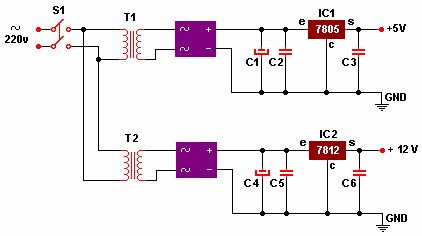 El circuito es muy sencillo, consiste en una fuente doble, es decir, vamos a controlar dos tensiones distintas, una será para la interfaz, y la otra para alimentar los motores, como los que yo tengo son de 12 voltios, utilicé un regulador de tensión 7812, y para la interfaz un 7805, los transformadores, obviamente corresponden al nivel de tensión a utilizar, el de los motores es de 1A, y el otro más pequeño es de 300 mA, aquí tienes el esquema del circuito...