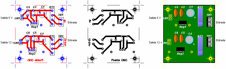 El valor de los Capacitores, C2, C3, C5 y C6 es de 0.1uf, preferiblemente de Poliester, C1 es de 2200uf/16V y C4 de 2200uf/35V. Sería bueno que le coloques disipadores a los reguladores de tensión, para evitar que se dañen, o que comiencen a recalentar. Aquí las 3 típicas imágenes del pcb...
