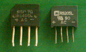 Antes que lo olvide, ves esos cuadros violetas, bueno, se conocen como puentes rectificadores, creo que no los habíamos incluido en ninguno de los circuitos que vimos hasta ahora, en realidad están reemplazando a los típicos 4 Diodos, que son los que se usan comúnmente, lo que tienen de bueno es que simplifican un poco el circuito, a demás los puedes encontrar en las fuentes de alimentación que solían venir en las antiguas PC's, que si seguramente tienes una inservible, puedes sacarlo de allí, aquí tienes una imagen de este componente...