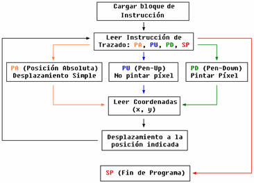 A ver... Ya sabemos como cargar el programa, y si recuerdas, cada registro del List es un bloque de instrucciones, y a demás cada bloque de instrucciones está arreglado para que comience con cualquiera de las 4 opciones que se pueden ver en el Diagrama, es decir PA, PU, PD, SP, estas instrucciones son suficientes para trazar cualquier gráfico hecho en AutoCAD (bueno, con algunas excepciones).