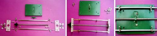 Es un poco imposible conseguir todos los accesorios que uno necesita para la construcción, así que hay que adaptarse a lo que encontramos, la guía sobre la que se desplaza la mesa, son dos caños estructurales y cuadrados, primero por que no encontramos varillas redondas que cumpla con todos los requisitos que se necesitan, y segundo, que es necesario un juego de rodamientos que elevan demasiado la mesa, sería bueno que fueran rodamientos pequeños, y lo más ancho posible, pero bueno, no los encontré, de todos modos se nos simplificó un poco ya que luego colocamos 4 ángulos de acero que se apoyan sobre estos caños, esos son los que se ven en la primer foto a los costados del tablero...