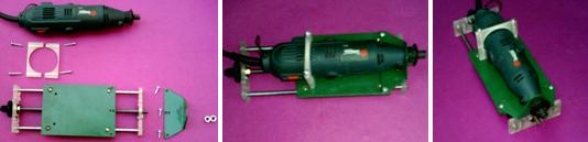 Bueno, aquí ya aparecieron otro par de accesorios, primero, el Mini-taladro y al lado, una abrazadera que será la que lo sostendrá por la parte superior, y otra que parece un trapecio, en realidad es una planchuela de acero, doblada en L, que de un lado tiene un orificio por donde pasa la punta del taladro, a la vez sirve para ajustarlo y fijarlo en la misma base...