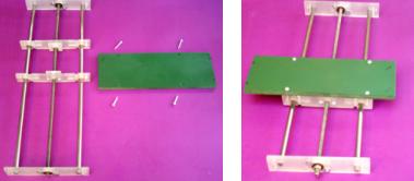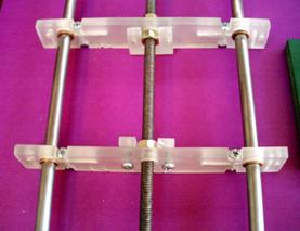 Entre los dos extremos de estos elementos, se deben colocar los bujes y el sostén para el carro que llevará el taladro, también se deben incluir las tuercas que lo arrastrarán de un lado a otro, esos son los que se ven en la siguiente imagen...