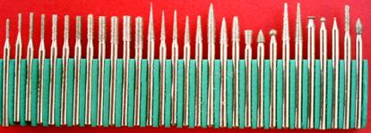 Una buena variedad de las que elegir verdad...?, pero no son las únicas que hay, es posible conseguir en las tiendas de odontólogos, una buena colección de accesorios que suelen utilizar para los tornos, son diminutas fresas ideales para esta máquina, algo como esto...