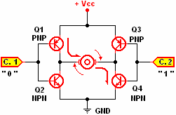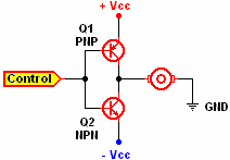 En este caso será necesario el uso de dos transistores complementarios es decir uno PNP y otro NPN, de este modo sólo es necesario un terminal de control, el cual puede tomar valores lógicos "0" y "1", el esquema de conexiones es el que sigue...