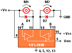 Una cosa más que quiero hacer notar... Observa que un motor (M1) esta unido a +Vs, mientras que el otro (M2) esta a GND, puedes utilizar cualquiera de las dos configuraciones, aquí las grafiqué tal como están en la hoja de datos, la cual de por sí, es demasiado clara, e intenta mostrar todas las posibilidades de conexión...
