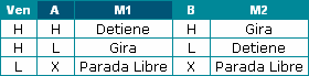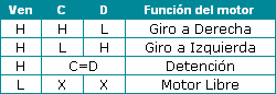 Esta tabla indica claramente como puedes controlar el motor, en un sentido o en otro, detenerlo o dejarlo libre, esto último de dejarlo libre se refiere a que cualquier señal en los terminales de control A, B, C y D no tendrán efecto alguno sobre el motor, es decir que ha quedado liberado totalmente.