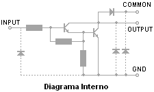 Se trata de un array de transistores Dárlington capaz de manejar hasta 500mA en sus salidas, sólo debes tener en cuenta que las salidas están invertidas respecto de las entradas, observa el diagrama interno de una de ellas, se puede apreciar que son de colector abierto. Bien, ahora montemos el siguiente circuito...