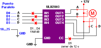 Y sí..., lo pondremos a funcionar con el puerto paralelo, no es que sea miedoso, pero por si las moscas, le puse 4 diodos 1N4148, y a demás un diodo zener de 12v para proteger al integrado, este circuito lo puedes montar en una placa de pruebas, que creo está demás decirlo.