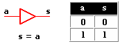 Ya la estaba dejando de lado..., no se si viene bien incluirla aquí pero de todos modos es bueno que la conozcas, en realidad no realiza ninguna operación lógica, su finalidad es amplificar un poco la señal (o refrescarla si se puede decir). Como puedes ver en el siguiente gráfico, la señal de salida es la misma que de entrada.
