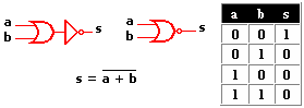 El resultado que se obtiene a la salida de esta compuerta resulta de la inversión de la operación lógica o inclusiva es como un no a y/o b. Igual que antes, solo agregas un círculo a la compuerta OR y ya tienes una NOR.