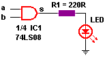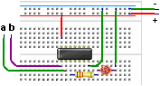 En el esquema está marcada la compuerta, como 1 de 4 disponibles en el Integrado 74LS08, los extremos a y b son las entradas que deberás llevar a un 1 lógico (+5V) ó 0 lógico (GND), el resultado en la salida s de la compuerta se verá reflejado en el LED, LED encendido (1 lógico) y LED apagado (0 lógico), no olvides conectar los terminales de alimentación que en este caso son el pin 7 a GND y el 14 a +5V. Montado en la placa de prueba te quedaría algo así...