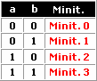 c)- Valor lógico de un minitérmino (esos que estaban escritos en rojo), bien, estos deben tener un valor lógico, y es el que resulta de la operación que se realiza entre las variables. lógicamente 0 ó 1
