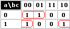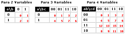 Bien... El Mapa de Karnaugh representa la misma tabla de verdad a través de una matriz, en la cual en la primer fila y la primer columna se indican las posibles combinaciones de las variables. Aquí tienes tres mapas para 2, 3 y 4 variables...