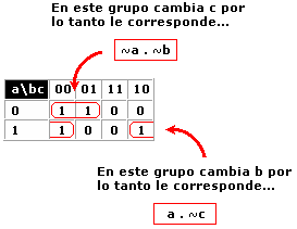 De ahora en más a cada grupo de unos se le asigna la unión (producto lógico) de las variables que se mantienen constante (ya sea uno o cero) ignorando aquellas que cambian, tal como se puede ver en esta imagen...