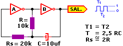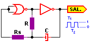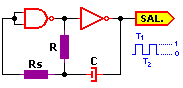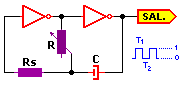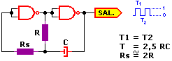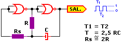 Este oscilador es simétrico ya que el tiempo que dura el nivel alto es igual al que permanece en nivel bajo, este tiempo esta dado por T = 2,5 R C