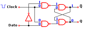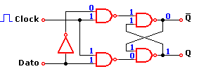 En este circuito no existe la posibilidad de que las dos entradas estén a nivel alto, ya que posee un inversor entre una y otra, de tal modo que R = ~S, observa el siguiente gráfico, aquí se supone la entrada Dato a nivel 0...