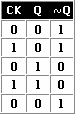 Ahora bien, cuando CK regrese a su estado inicial (CK=0) el Slave conmutará las salidas Q y ~Q quedando Q=1 y ~Q=0. Al cambiar de estado CK (CK=1) las salidas no serán afectadas. Esto se puede resumir en una pequeña tabla de verdad, como ésta...