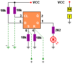5 : No tiene importancia la polaridad de las entradas de Reloj y Dato, ya que el cambio de estado se produce llevando Set a 1, y se mantendrá en él aunque esta entrada vuelva a 0. Sólo se volverá al estado anterior (reposo) llevando momentáneamente la entrada Reset a 1.