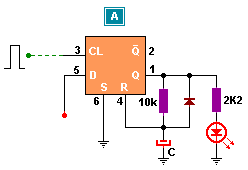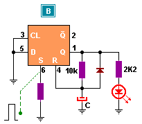 Para realizar un monoestable con este integrado solo se requiere de una Resistencia, un Diodo y un Capacitor. También en este caso se puede operar desde las entradas Reloj o Set y se obtendrán los mismos resultados.
