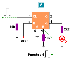 En "A" se trabaja para la puesta a 1 con la entrada de Reloj, y para la puesta a 0 con Reset. Se requiere que la entrada Dato se encuentre en 1.