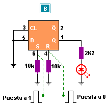 En "B" se utiliza como un clásico FF R-S, es decir la entrada Set para la puesta a 1 y la entrada Reset para la puesta a 0. Las entradas de Reloj y Dato, en este caso son irrelevantes, es como si no existieran, por lo tanto no tiene importancia el nivel en ellas, en este caso se conectaron a masa para no dejarlas al aire, si estarían a VCC daría igual.