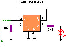 La llave oscilante o vaivén, cambia de estado con cada pulso de flanco ascendente en la entrada Reloj, en el primero se pone a uno, en el segundo se pone a cero.