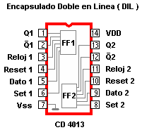 Este integrado es un doble flip-flop tipo D, en la figura siguiente se puede observar la disposición de terminales y la tabla de verdad correspondiente, numerada de 1 a 6 para interpretar con mayor claridad el análisis de la misma...