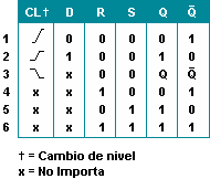 1 : En este renglón las entradas están todas en "0"; la transición en sentido positivo del pulso de reloj, no tiene efecto en las salidas, por lo que la salida Q se mantiene en 0 y -Q en 1.