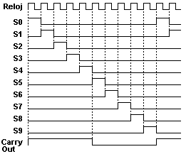 Partiendo entonces de la situación inicial en que "S0" se encuentra a nivel alto y todas las demás a nivel bajo. Con la llegada del primer pulso de entrada tenemos la primera transición. "S0" pasa a nivel bajo y "S1" a nivel alto, todas las demás permanecen en cero.