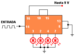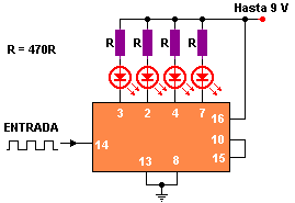 Las salidas de este integrado proporcionan corrientes lo suficientemente intensas como para excitar LED's y en aplicaciones de mayor potencia, transistores comunes.