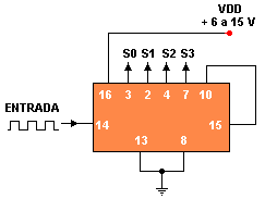 "Reset" Si se le aplica un nivel alto, lleva ese nivel al terminal "S0", volviendo a iniciar el recuento. Eso significa que si conectamos este terminal a cualquier salida, cuando ésta se lleve a nivel alto se iniciará un nuevo ciclo. Es decir que si conectamos "S4" a la entrada "Reset" tendremos un recuento sólo hasta 4.