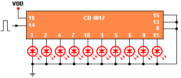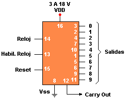 "Carry-Out" Este terminal proporciona un ciclo completo a cada 10 pulsos de entrada, pudiendo usarse para excitar otro 4017 para división sucesiva de frecuencia o recuento por un número superior a 10