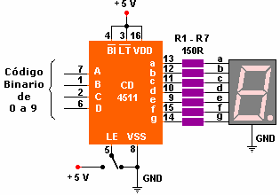Las entradas de prueba (LT), borrado (BI) y habilitación de Cerrojo (LE), se usan para probar el visualizador, para apagar o modular por pulsos el visualiador, y para almacenar un código BCD, respectivamente. Se puede usar con indicadores o Diodos LED
