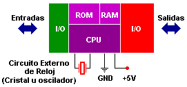 Aquí tienes una representación en bloques del microcontroador, para que te des una idea, y puedes ver que lo adaptamos tal y cual es un ordenador, con su fuente de alimentación, un circuito de reloj y el chip microcontrolador, el cual dispone de su CPU, sus memorias, y por supuesto, sus puertos de comunicación listos para conectarse al mundo exterior.