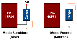 La máxima capacidad de corriente de cada uno de los pines de los puertos en modo sumidero (sink) es de 25 mA y en modo fuente (source) es de 20 mA. La máxima capacidad de corriente total de los puertos es: