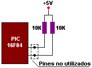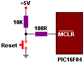 El PIC 16C84/F84 posee internamente un circuito temporizador conectado al pin de reset que funciona cuando se da alimentación al micro, se puede entonces conectar el pin de MCLR a la fuente de alimentación. Esto hace que al encender el sistema el microcontrolador quede en estado de reset por un tiempo mientras se estabilizan todas las señales del circuito (lo cual es bastante bueno, por eso siempre la usaremos...).