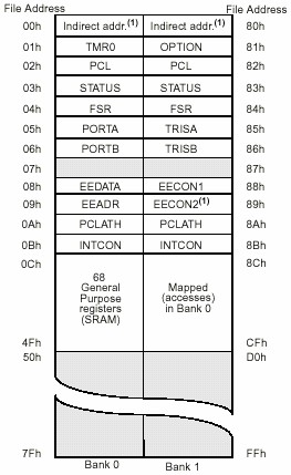 1. RAM estática ó SRAM: donde residen los Registros Específicos (SFR) con 24 posiciones de tamaño byte, aunque dos de ellas no son operativas y los Registros de Propósito General (GPR) con 68 posiciones. La RAM del PIC16F84A se halla dividida en dos bancos (banco 0 y banco 1) de 128 bytes cada uno (7Fh)