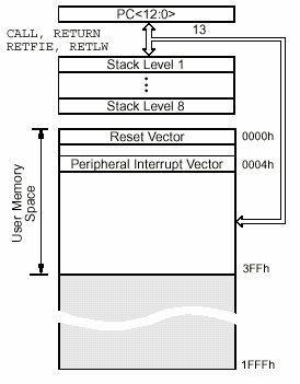 Algo que se debe tener en cuenta es la pila o Stack, que consta de 8 posiciones (o niveles), esto es como una pila de 8 platos el último en poner es el primero en sacar, si seguimos con este ejemplo, cada plato contiene la dirección y los datos de la instrucción que se está ejecutando, así cuando se efectúa una llamada (CALL) o una interrupción, el PC sabe donde debe regresar (mediante la instrucción RETURN, RETLW o RETFIE, según el caso) para continuar con la ejecución del programa.