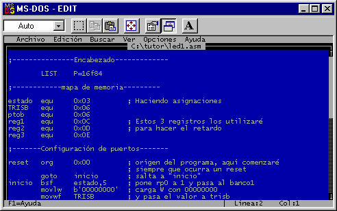 Una vez ahí puedes escribir tu código..., por último lo guardamos seleccionando el menú Archivo --> Guardar como --> led1.asm No olvides el .asm