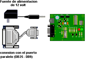 Bien, ya tenemos LED1.HEX y es el que cargaremos en el pic. Lo que viene es una imagen representativa del grabador de pic, con el cable que se conectará al puerto paralelo, y la fuente de alimentación externa. No coloques el PIC sin haber hecho las conexiones anteriores.