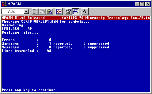 Ésto, generará el archivo LED1.ERR, LED1.LST, y LED1.HEX, este último es el que estamos buscando, los anteriores sirven para saber si se cometió algún error, si es así debes abrirlos (con el Bloc de Notas es suficiente) corregir los errores y ensamblar nuevamente.