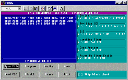 haciendo click en Open File seleccionas LED1.HEX y aquí está...