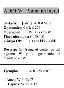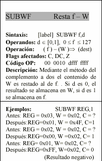 - d : Bit del código OP de la instrucción. Selecciona el destino donde se guarda el resultado de una operación. Si d=0, el destino es W, y si d=1 el destino es f.