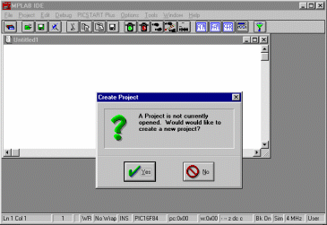 Que según mi inglés dice algo así... "No existe ningún proyecto abierto, desea crear uno?", y como en eso andamos, seleccionas "YES", nota que también se abrió una página en blanco "Untitled1", bueno, en ella es que introduciremos nuestro código, pero sigamos...
