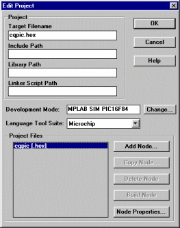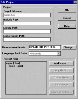 Desde aquí vamos a ligar al proyecto nuestro archivo .asm, que es el que codificaremos, y que todavía no hemos creado, de todos modos sabemos que se llamará cqpic.asm otra cosa que debes tener en cuenta es que deberás guardarlo en el mismo directorio en que creaste el proyecto, luego presionas Aceptar y regresarás al cuadro Edit Project pero de la mano de nuestro cqpic[.asm] observa...