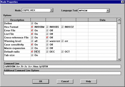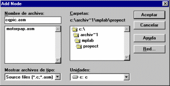 Como verás aquí también hay algunas cositas ya conocidas, como INHX8M (nuestro código objeto con extensión .hex), el fichero de errores (.err), el archivo list (.lst), Default Radix que vendría a ser el formato de los números que vamos a utilizar (hexadecimal), etc., bien, ahora presionamos OK y volvemos a la ventana anterior, seleccionas Add Node y verás el siguiente diálogo...